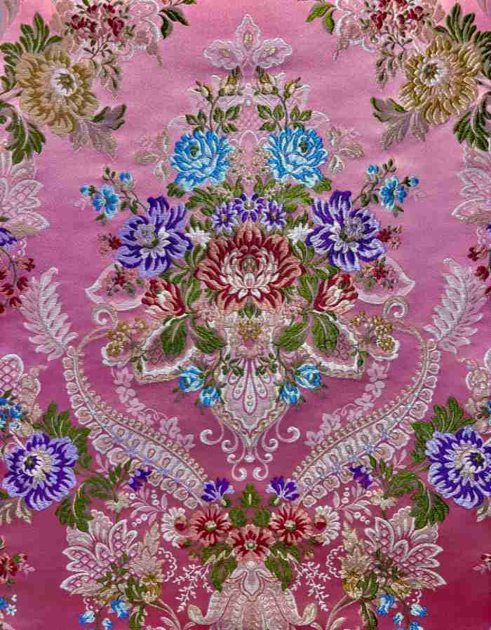 Corte de tela de valenciana de 5,5 metros con fondo rosa y trama oro