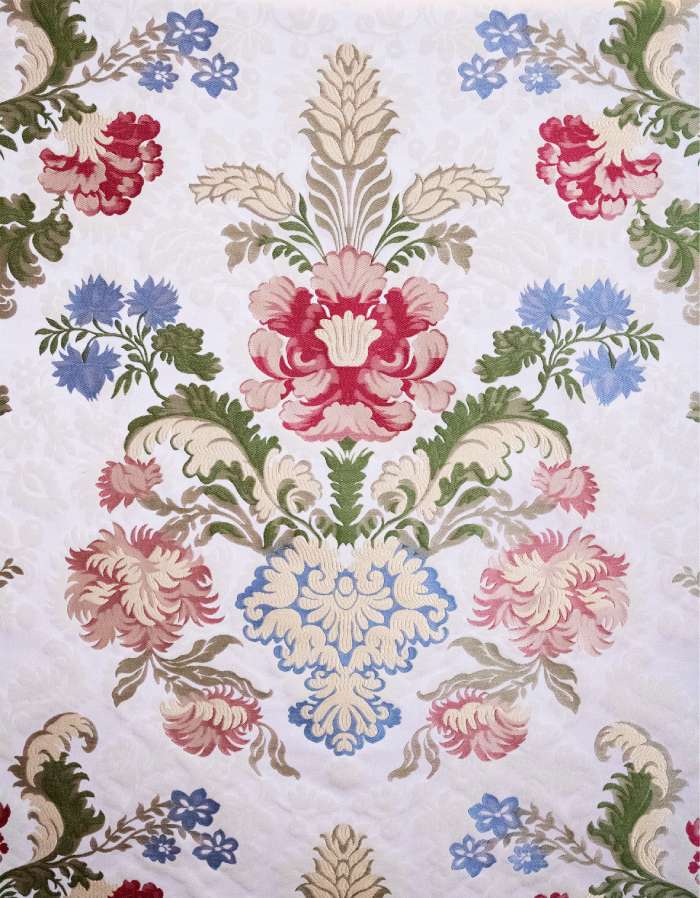 Corte de tela de valenciana de 6 metros con fondo de color blanco y trama oro con colorido T20000.