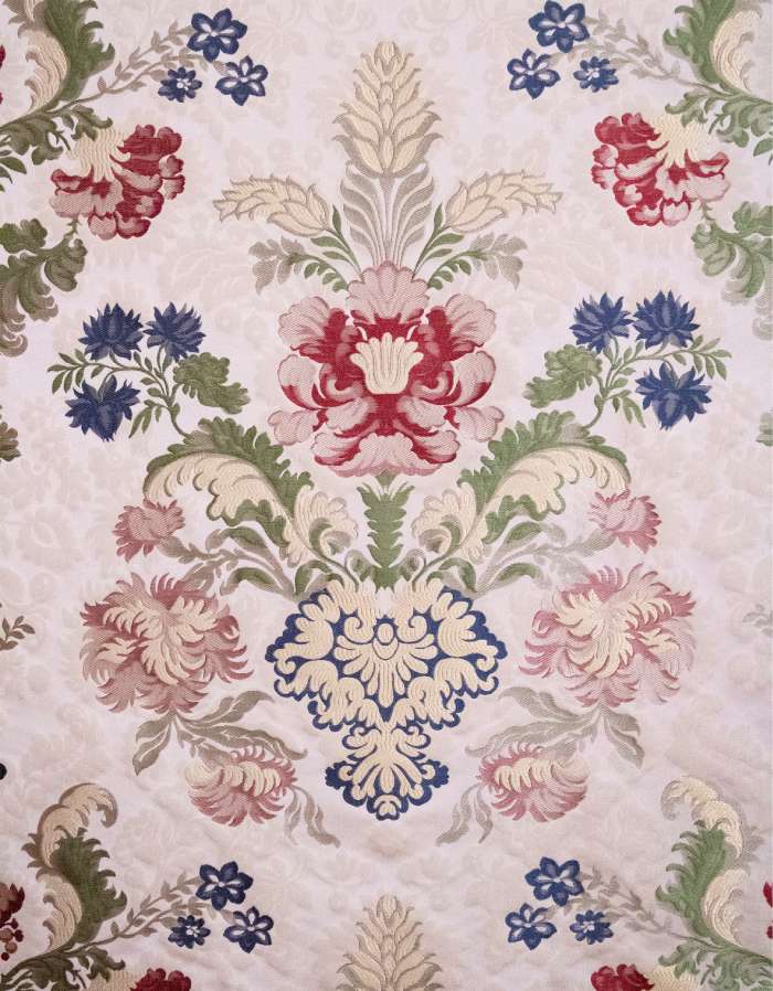Corte de tela de valenciana de 6 metros con fondo de color vainilla y trama oro con colorido T27100.
