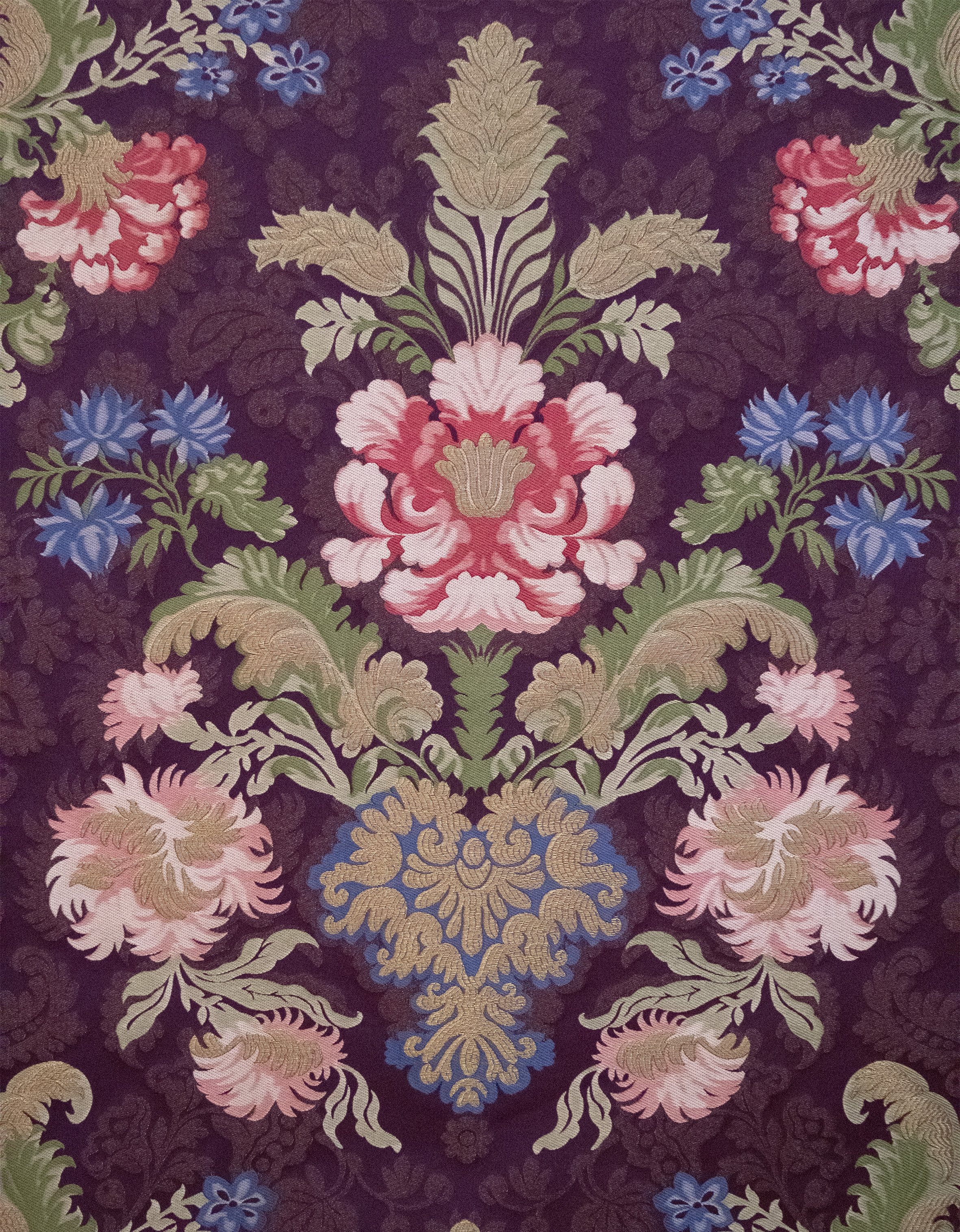 Corte de tela de valenciana de 6 metros con fondo de color cardenal y trama oro con colorido T27050.