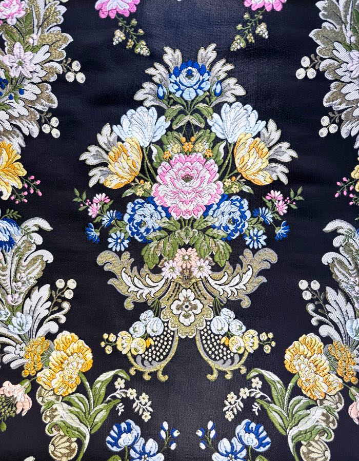 Corte de tela valenciana de 6metros. Fondo de color negro. Trama oro.