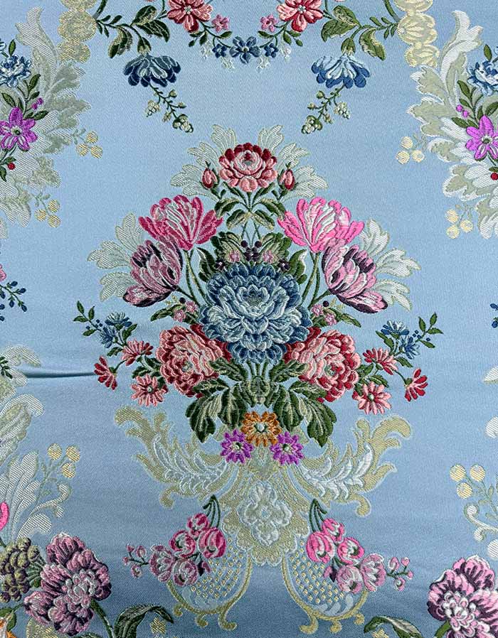 Corte de tela valenciana de 5,5 metros. Fondo de color hielo y trama oro.