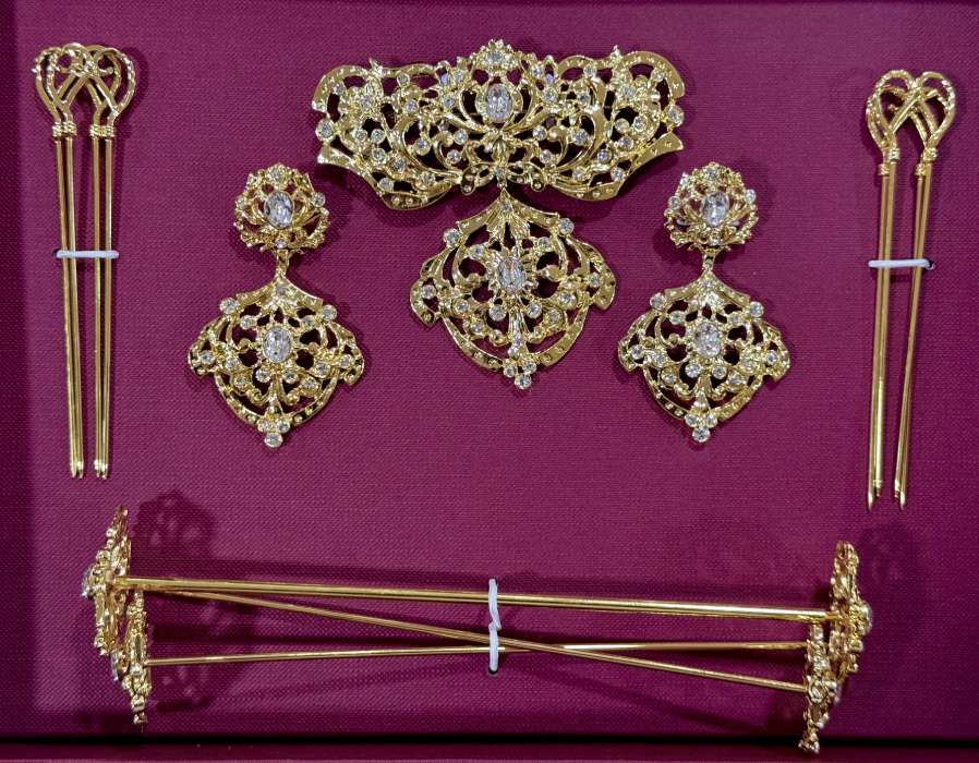 Aderezo de valenciana bañado en oro, con piedras en cristal.