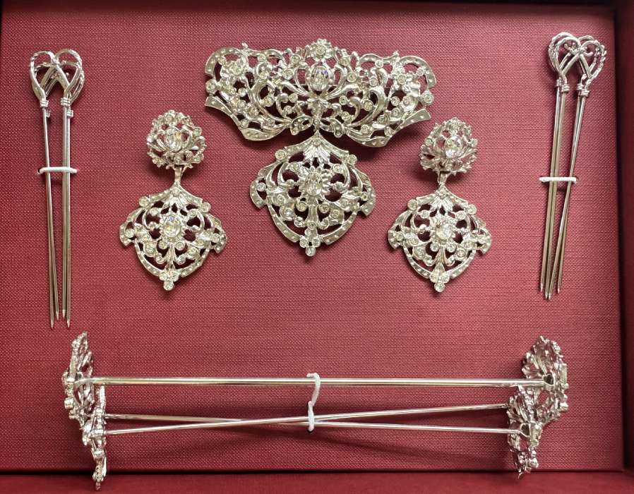 Aderezo de valenciana bañado en platino, con piedras en cristal.