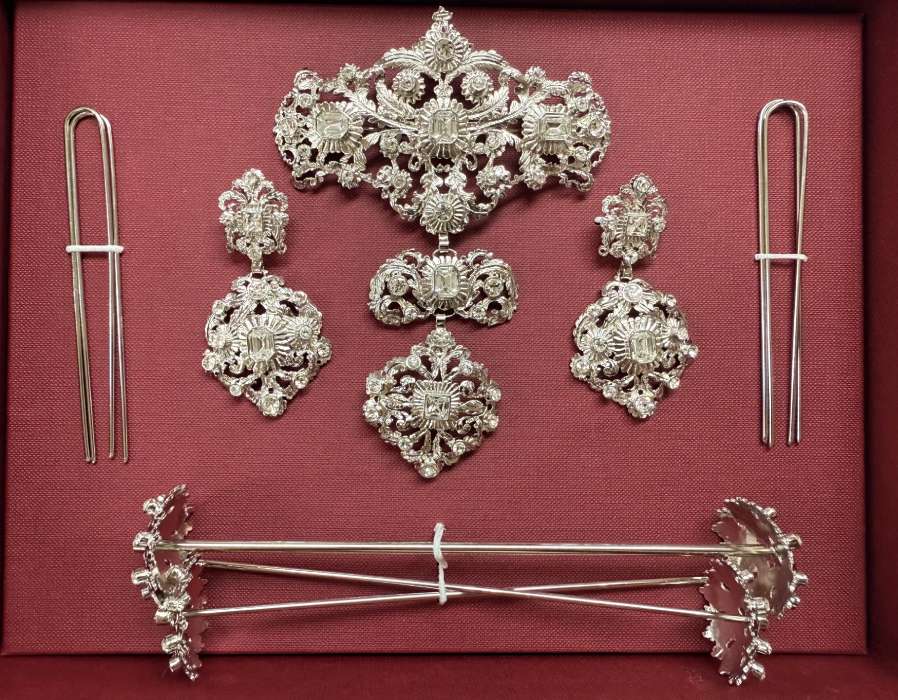 Aderezo de valenciana bañado en platino, con piedras en cristal.