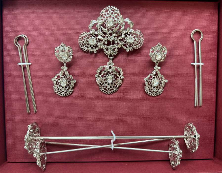 Aderezo de valenciana bañado en platino, con piedras en cristal.
