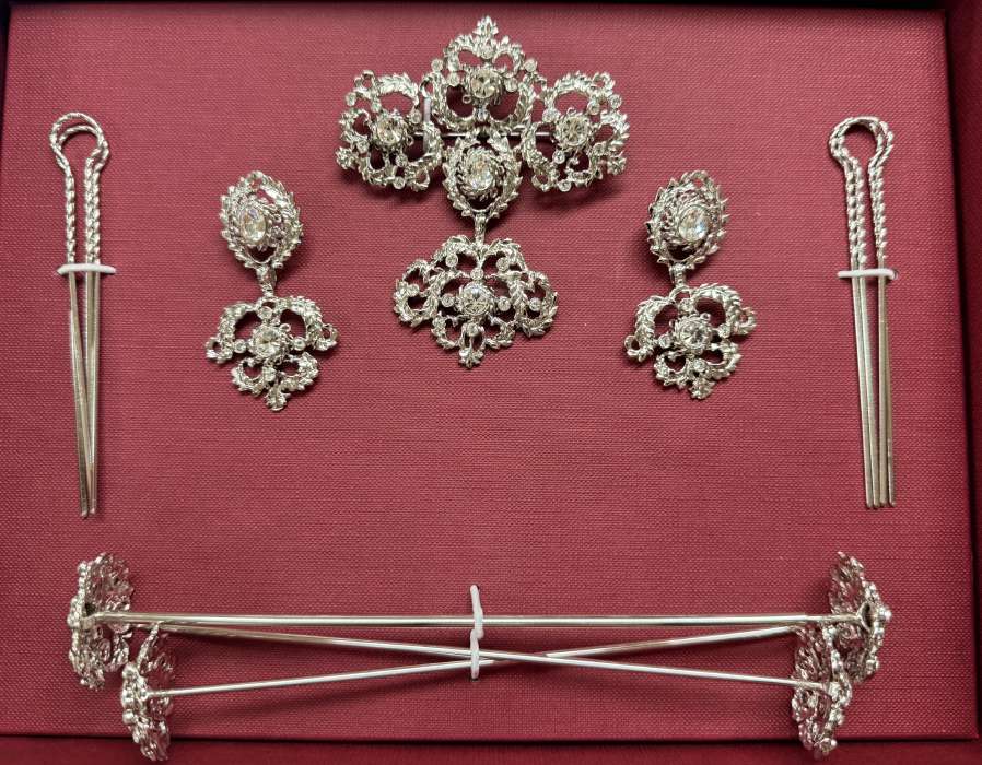Aderezo de valenciana bañado en platino, con piedras en cristal.