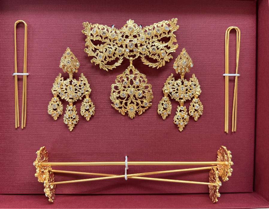 Aderezo de valenciana bañado en oro mate, con piedras en cristal.