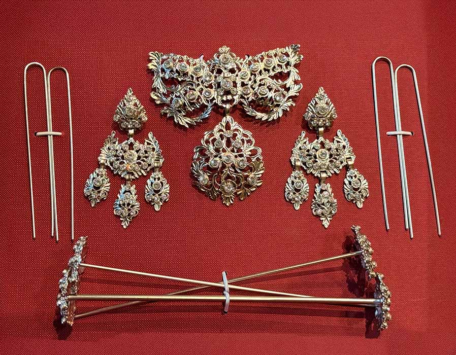 Aderezo de valenciana bañado en platino mate, con piedras en cristal.