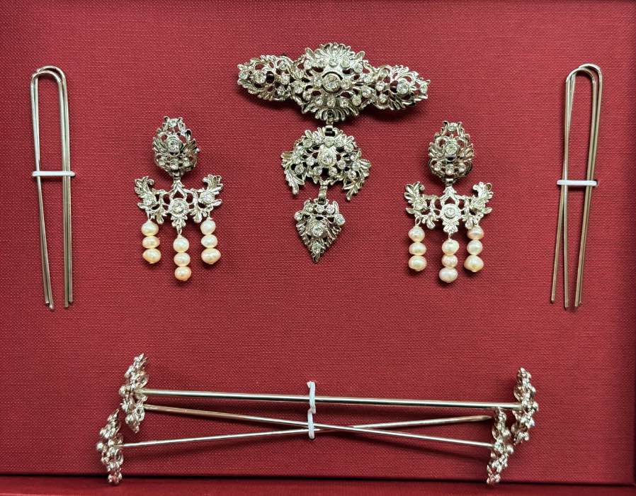 Aderezo de valenciana bañado en platino con adornos en cristal y perlas.