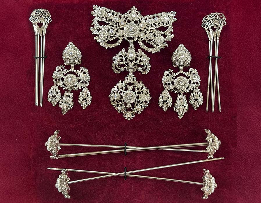 Aderezo de valenciana en tamaño grande , bañado en rodio con piedras en cristal y perlas.