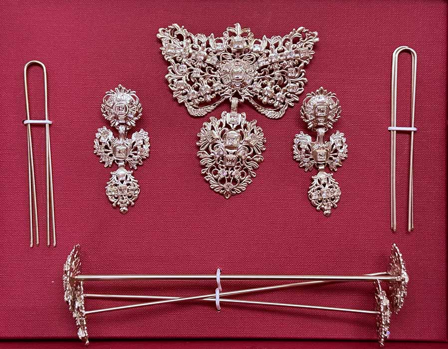 Aderezo de valenciana bañado en platino mate, con piedras en cristal.