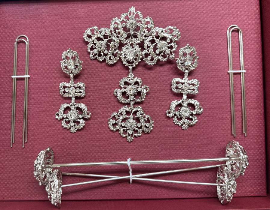 Aderezo de valenciana bañado en platino, con piedras en cristal.