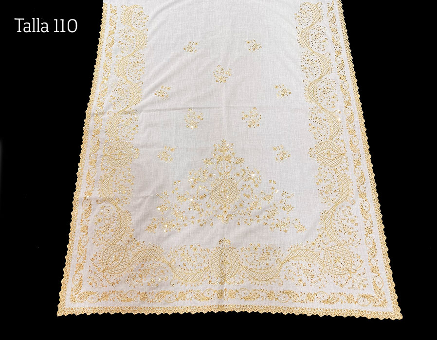 Juego de manteletas de batista (pico y delantal) en talla 110. Bordado en oro viejo con lentejuela oro.