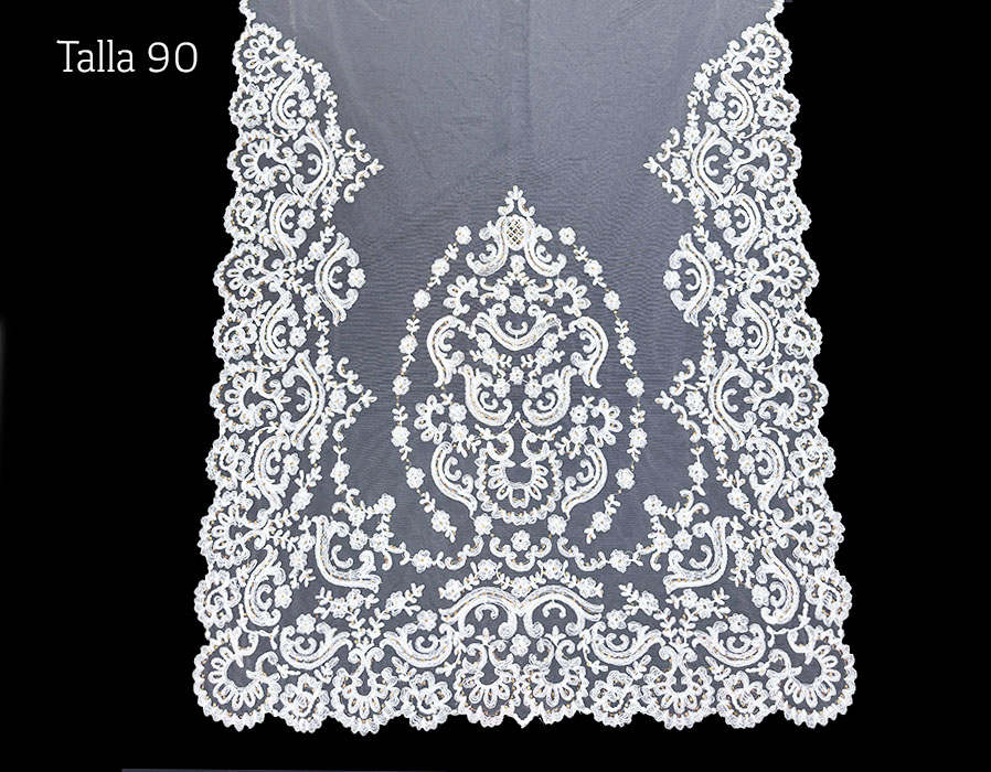 Juego de manteleta (pico y delantal) en talla 90.Fabricada en tul bordada en blanco y lentejuela oro.