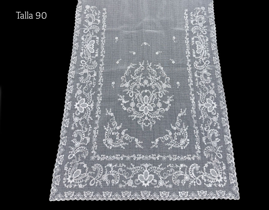 Juego de manteleta (pico y delantal) en talla 90.Fabricado en muselina rustica y bordado en beige claro con lentejuela en plata.