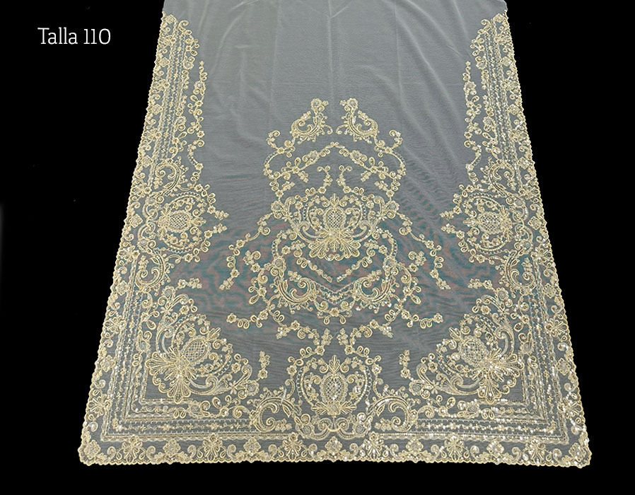 Juego de manteleta de(pico y delantal) en talla 110. Fabricado en tul algodón fino y bordado en beige claro con lentejuela en oro.
