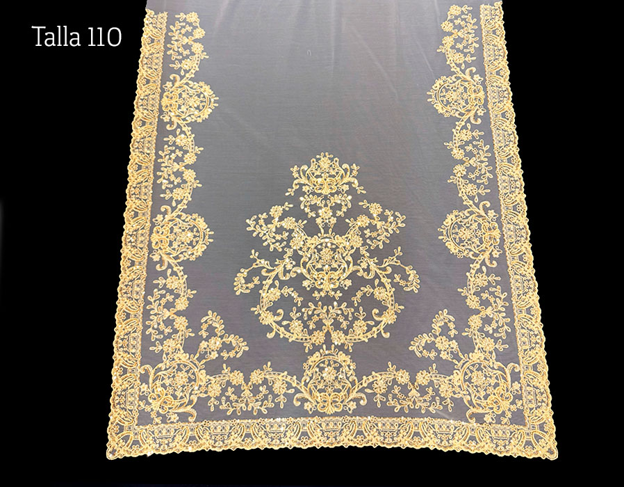 Juego de manteleta (pico y delantal) en talla 110. Fabricado en tul algodón fino y bordado en oro con lentejuela en oro.