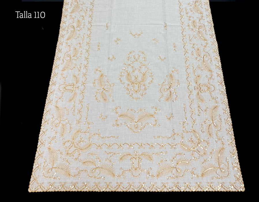 Juego de manteleta de(pico y delantal) en talla 110. Fabricado en tul algodón y bordado en oro antiguo con lentejuela en oro.