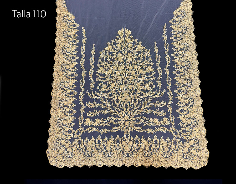Juego de manteleta (pico y delantal) en talla 110. Fabricado en tul cristal y bordado en oro con lentejuela en oro.