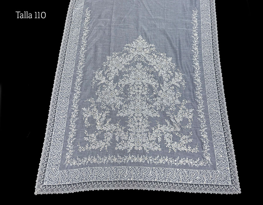 Juego de manteleta (pico y delantal) en talla 110. Fabricado en tossa y bordado en beige con lentejuela en oro.