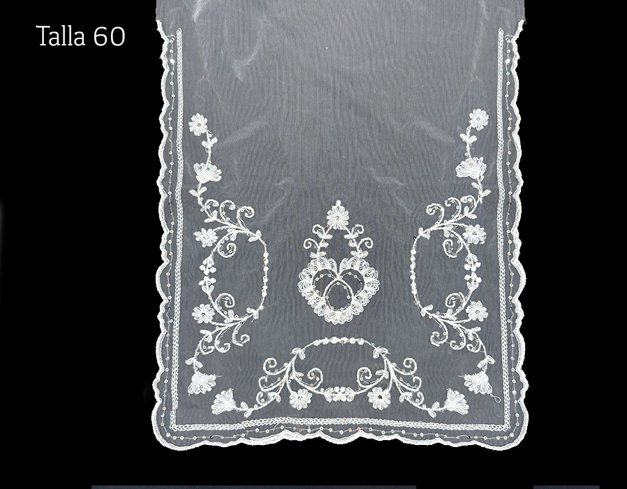 Juego de manteleta (pico y delantal) en talla 60. Fabricada en tul bordada en blanco con lentejuela en plata.