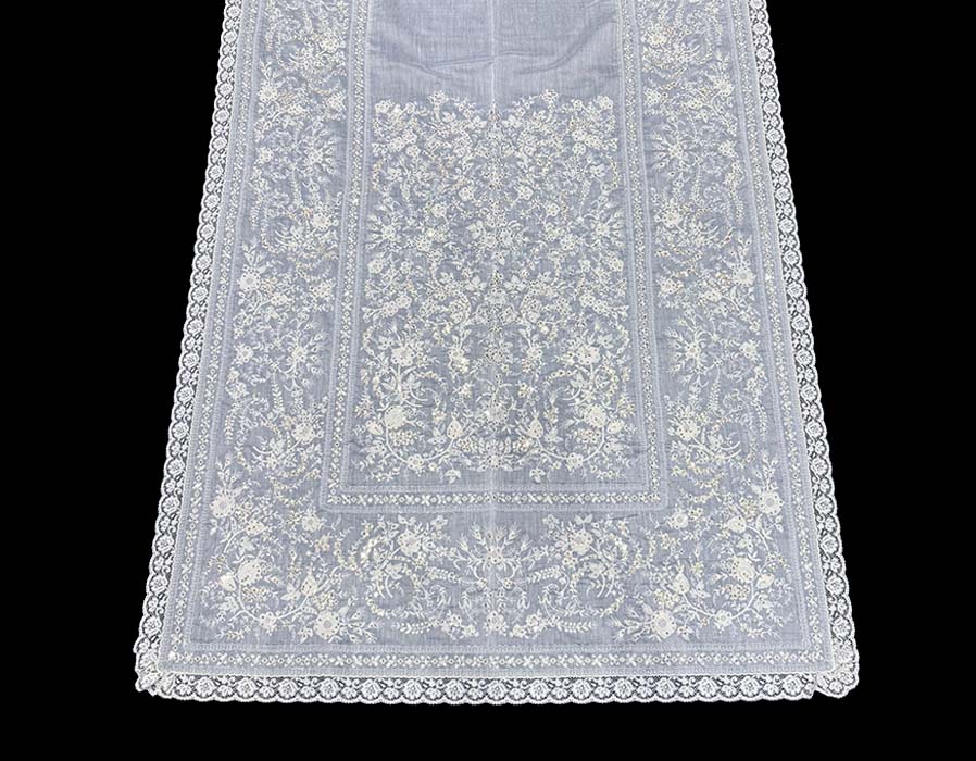 Juego de manteletas de muselina (pico y delantal) en talla 110. Bordado en beige con lentejuela oro.
