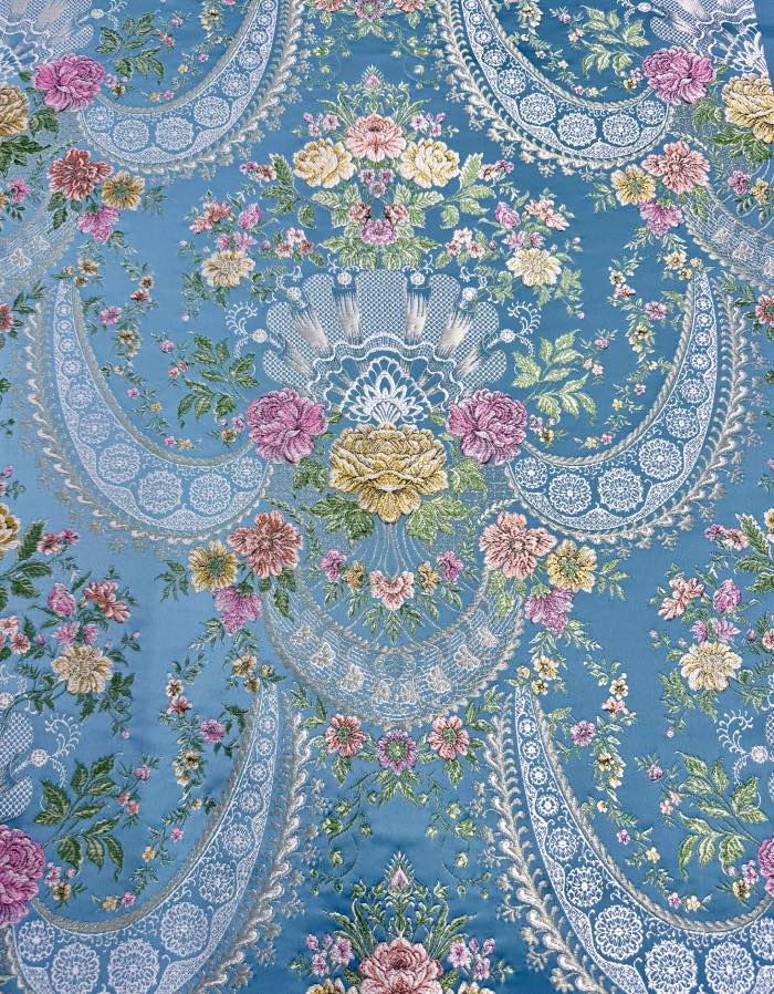 Corte estrecho de valenciana de 12 metros con fondo de color turquesa con trama oro